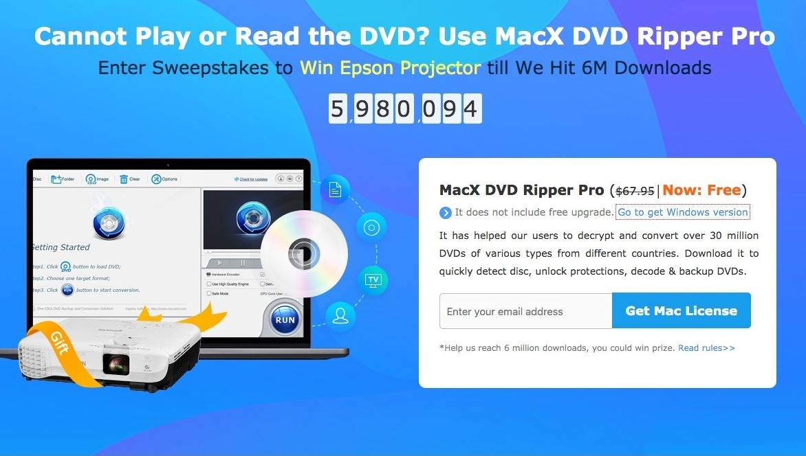 Scaricando gratuitamente MacX DVD Ripper Pro potrete anche partecipare ad un concorso per vincere un proiettore Epson (nello specifico si tratta del modello Epson VS250, del valore di circa 300 euro): se MacX DVD Ripper Pro raggiungerà i sei milioni di download, sarà estratto un fortunato vincitore che potrà portarsi a casa il dispositivo di Epson.