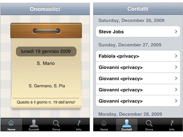 Per alcune tradizioni l’onomastico è addirittura più importante del compleanno: una pratica applicazione disponibile per iPhone e touch permette di avere sempre sotto mano il Santo del giorno e soprattutto di non perdere nemmeno un onomastico, inclusi quelli di tutte le persone memorizzate nei nostri contatti. Oltre a visualizzare il calendario sfogliando con un dito sullo schermo come siamo abituati a fare con il tascabili multi touch della Mela, è possibile ricercare i nomi di amici e parenti nel database in memoria, infine visualizzare le date degli onomastici di tutti i nostri contatti specificando il numero dei giorni dai includere nella ricerca.