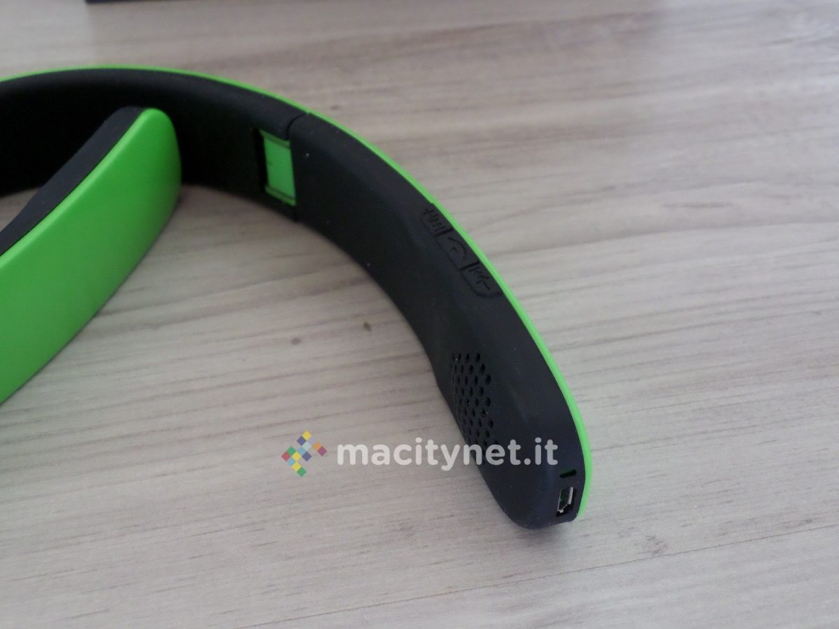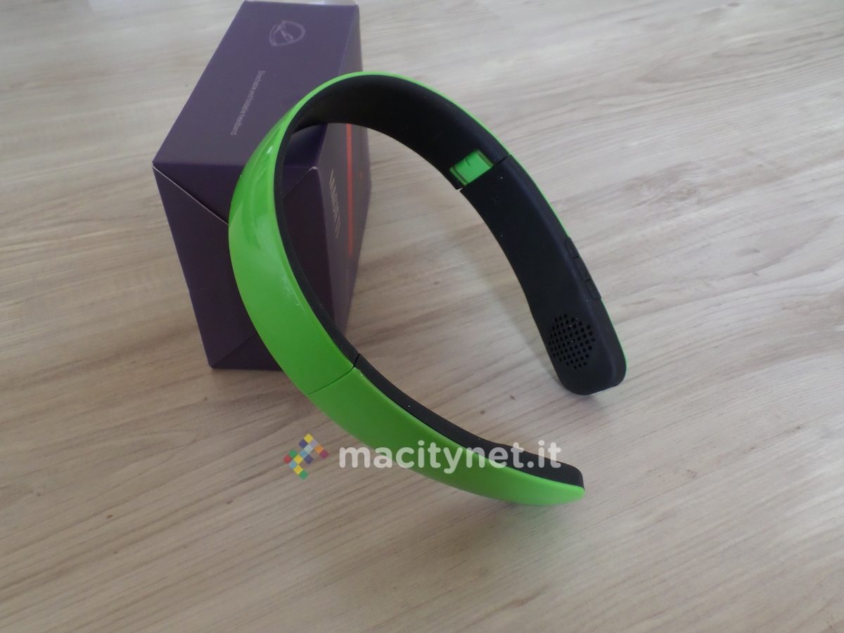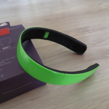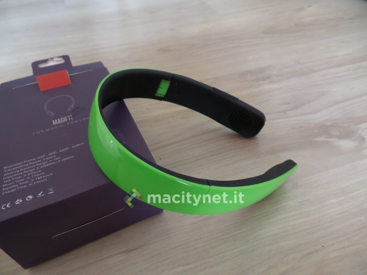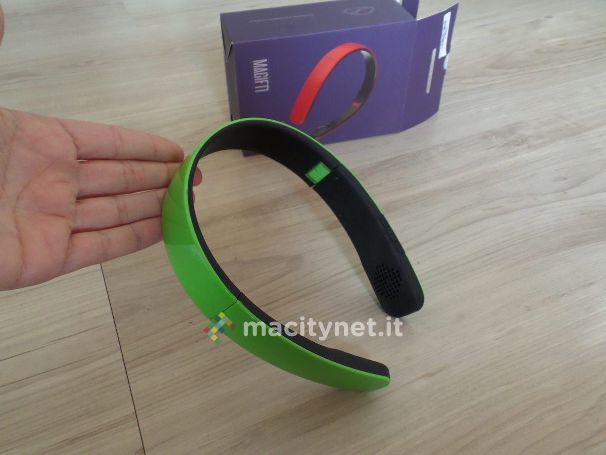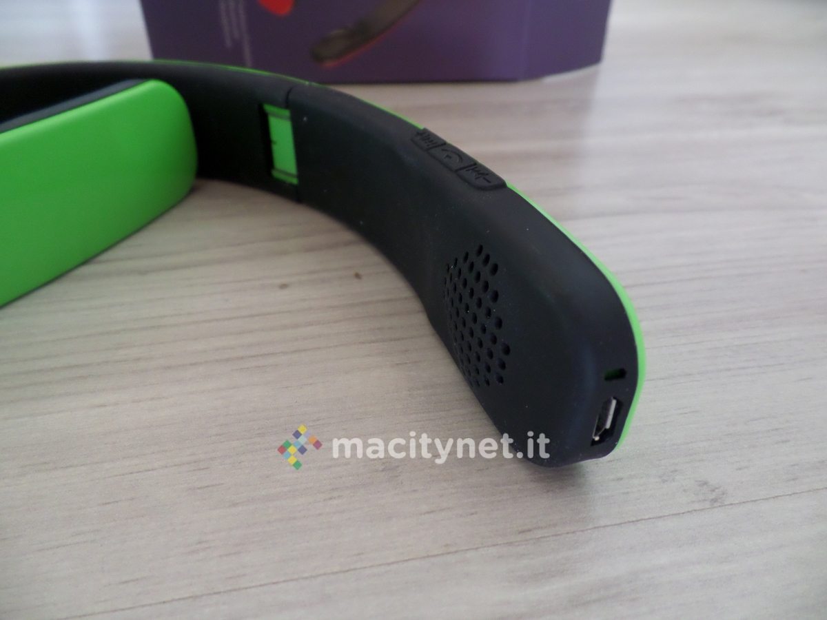 L’aspetto di queste cuffie Magift1 è, senza dubbio, la caratteristica che più colpisce. Completamente lucide, vengono proposte su Amazon in una colorazione verde o blu, entrambe molto appariscenti e dalle tonalità vive e accese. La superficie esterna del cerchietto è completamente liscia, senza alcun pulsante e senza alcun elemento estetico. All’interno, invece, il cerchietto è completamente ricoperto con un sottile strato antiscivolo opaco, che va a coprire anche i tre piccoli pulsanti posti sul padiglione auricolare destro. Non sempre è agevole premerli, perché con la cuffia indossata risultano estremamente vicini al viso, anche per via della leggera curvatura dell’arco, che li rende davvero adiacenti all’orecchio. Servono per accendere/spegnere la cuffia, oltre che per avviare la modalità pairing per il primo accoppiamento. Inoltre, consentono anche di rispondere/riagganciare la chiamata, o di mettere in pausa la musica in ascolto, potendo anche cambiare traccia musicale. Sempre sullo stesso lato, proprio sulla parte bassa del padiglione, è posizionato il foro per la ricarica MicroUSB.