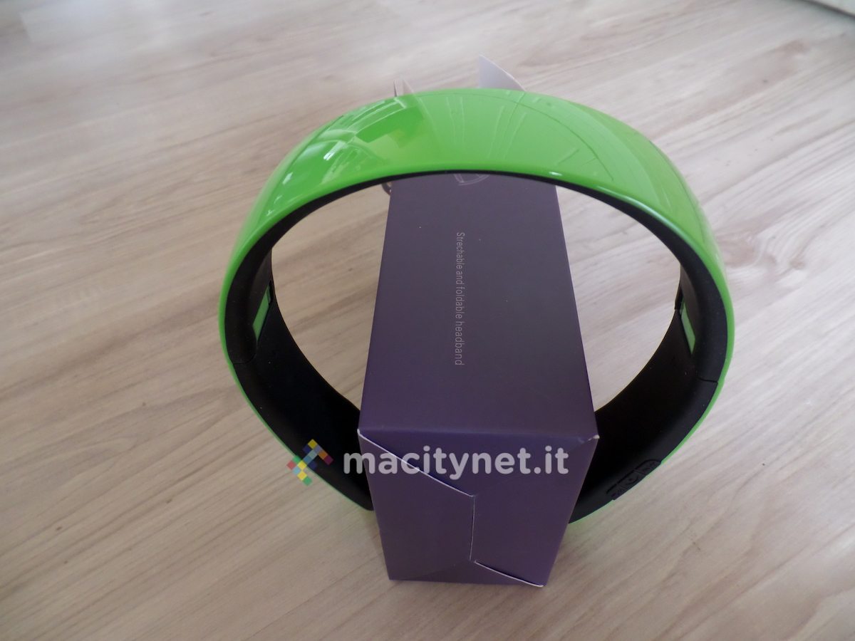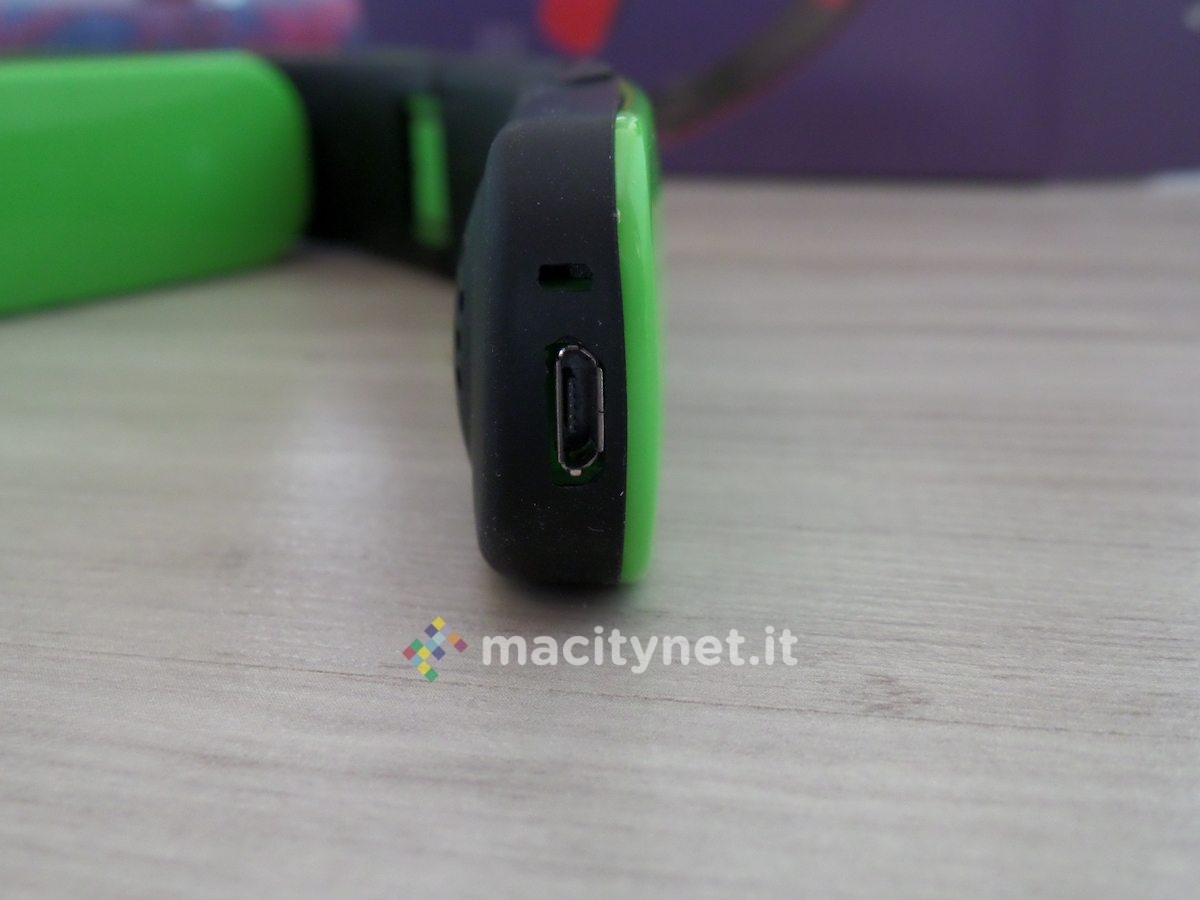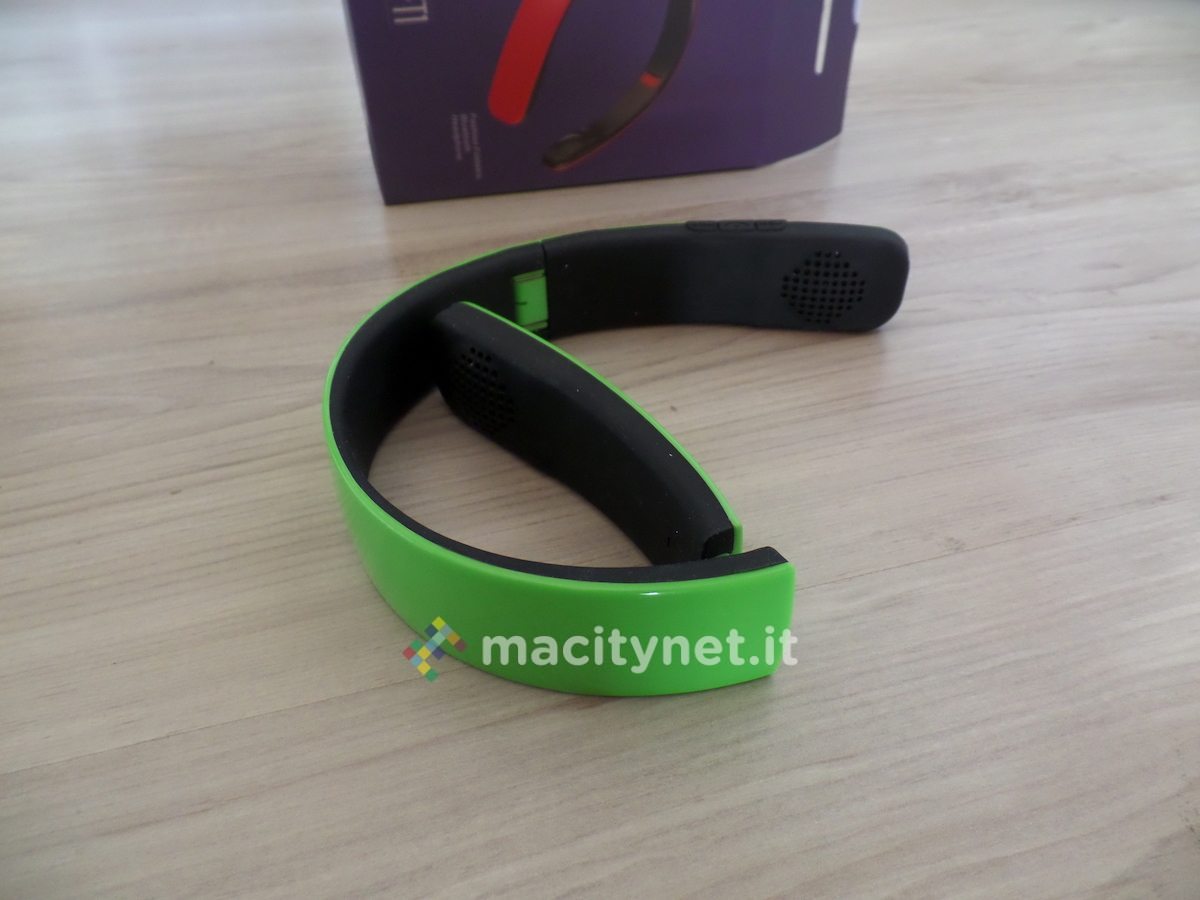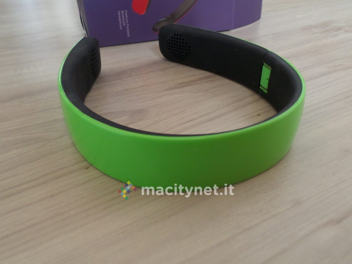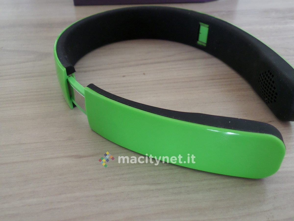 L’aspetto di queste cuffie Magift1 è, senza dubbio, la caratteristica che più colpisce. Completamente lucide, vengono proposte su Amazon in una colorazione verde o blu, entrambe molto appariscenti e dalle tonalità vive e accese. La superficie esterna del cerchietto è completamente liscia, senza alcun pulsante e senza alcun elemento estetico. All’interno, invece, il cerchietto è completamente ricoperto con un sottile strato antiscivolo opaco, che va a coprire anche i tre piccoli pulsanti posti sul padiglione auricolare destro. Non sempre è agevole premerli, perché con la cuffia indossata risultano estremamente vicini al viso, anche per via della leggera curvatura dell’arco, che li rende davvero adiacenti all’orecchio. Servono per accendere/spegnere la cuffia, oltre che per avviare la modalità pairing per il primo accoppiamento. Inoltre, consentono anche di rispondere/riagganciare la chiamata, o di mettere in pausa la musica in ascolto, potendo anche cambiare traccia musicale. Sempre sullo stesso lato, proprio sulla parte bassa del padiglione, è posizionato il foro per la ricarica MicroUSB.