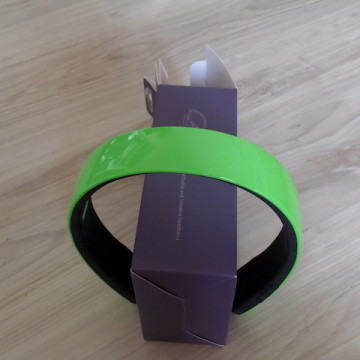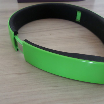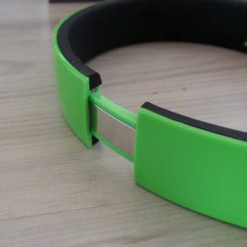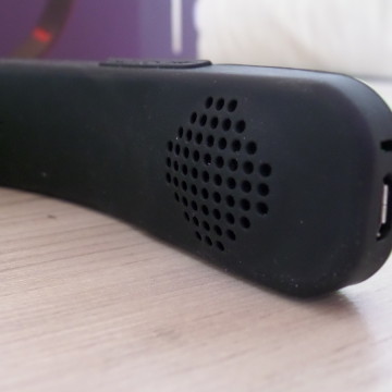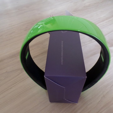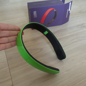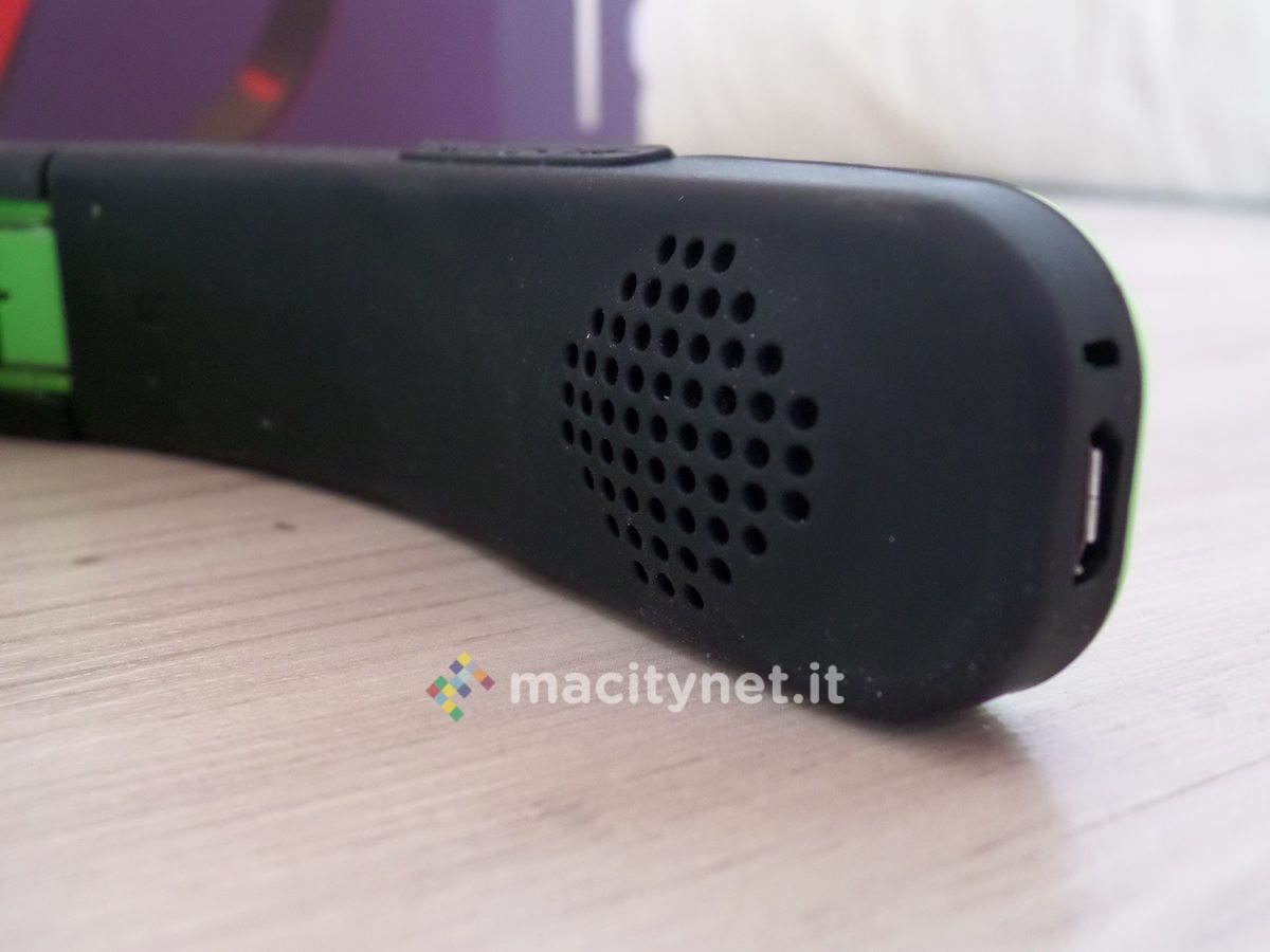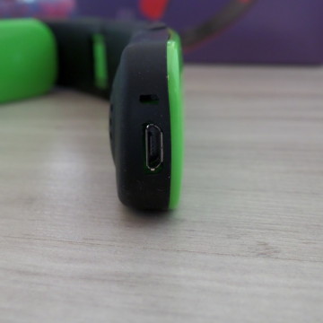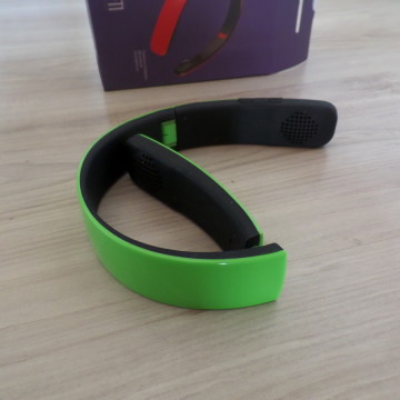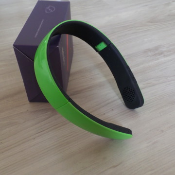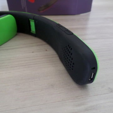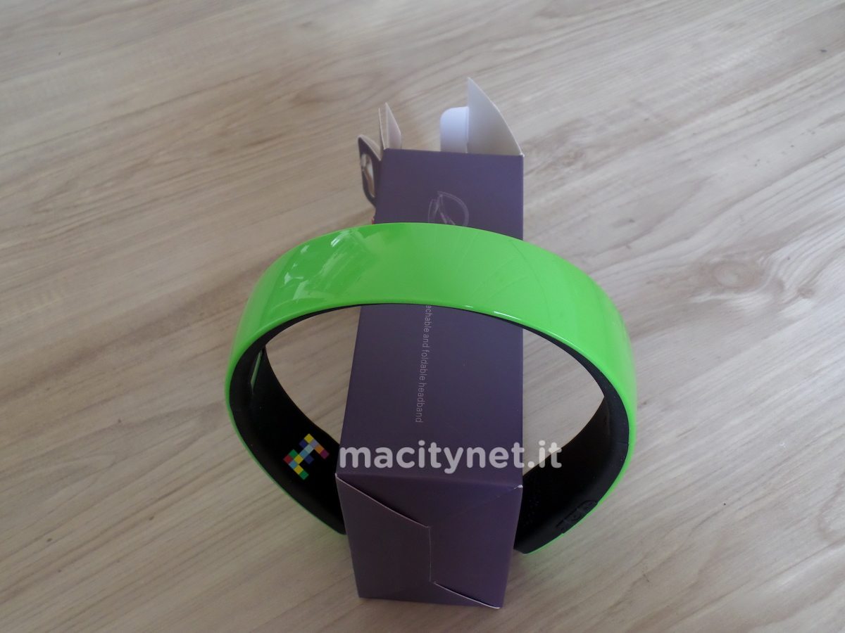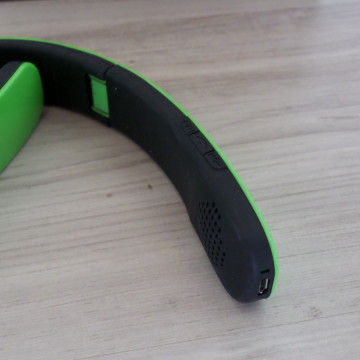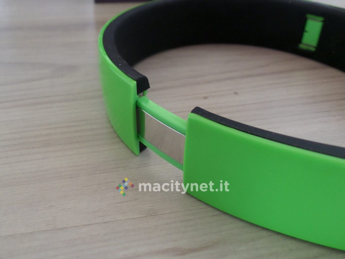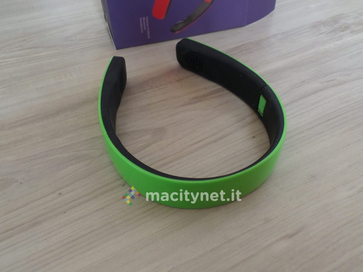 L’aspetto di queste cuffie Magift1 è, senza dubbio, la caratteristica che più colpisce. Completamente lucide, vengono proposte su Amazon in una colorazione verde o blu, entrambe molto appariscenti e dalle tonalità vive e accese. La superficie esterna del cerchietto è completamente liscia, senza alcun pulsante e senza alcun elemento estetico. All’interno, invece, il cerchietto è completamente ricoperto con un sottile strato antiscivolo opaco, che va a coprire anche i tre piccoli pulsanti posti sul padiglione auricolare destro. Non sempre è agevole premerli, perché con la cuffia indossata risultano estremamente vicini al viso, anche per via della leggera curvatura dell’arco, che li rende davvero adiacenti all’orecchio. Servono per accendere/spegnere la cuffia, oltre che per avviare la modalità pairing per il primo accoppiamento. Inoltre, consentono anche di rispondere/riagganciare la chiamata, o di mettere in pausa la musica in ascolto, potendo anche cambiare traccia musicale. Sempre sullo stesso lato, proprio sulla parte bassa del padiglione, è posizionato il foro per la ricarica MicroUSB.