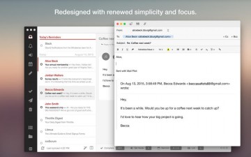 Lo sviluppo dell’applicazione è stato possibile grazie ad un progetto partito su Kickstarter tre anni addietro. È arrivata prima la versione per iOS (iPhone e iPad) e poi la versione per Mac. Una serie di comode scorciatorie permettono di inviare una risposta rapida ai messaggi, così come archiviarli all’interno di una cartella già presente o su una particolare lista dedicata. È possibile gestire firme e le classiche impostazioni inerenti i vari profili, eseguire velocemente ricerche e molto altro.