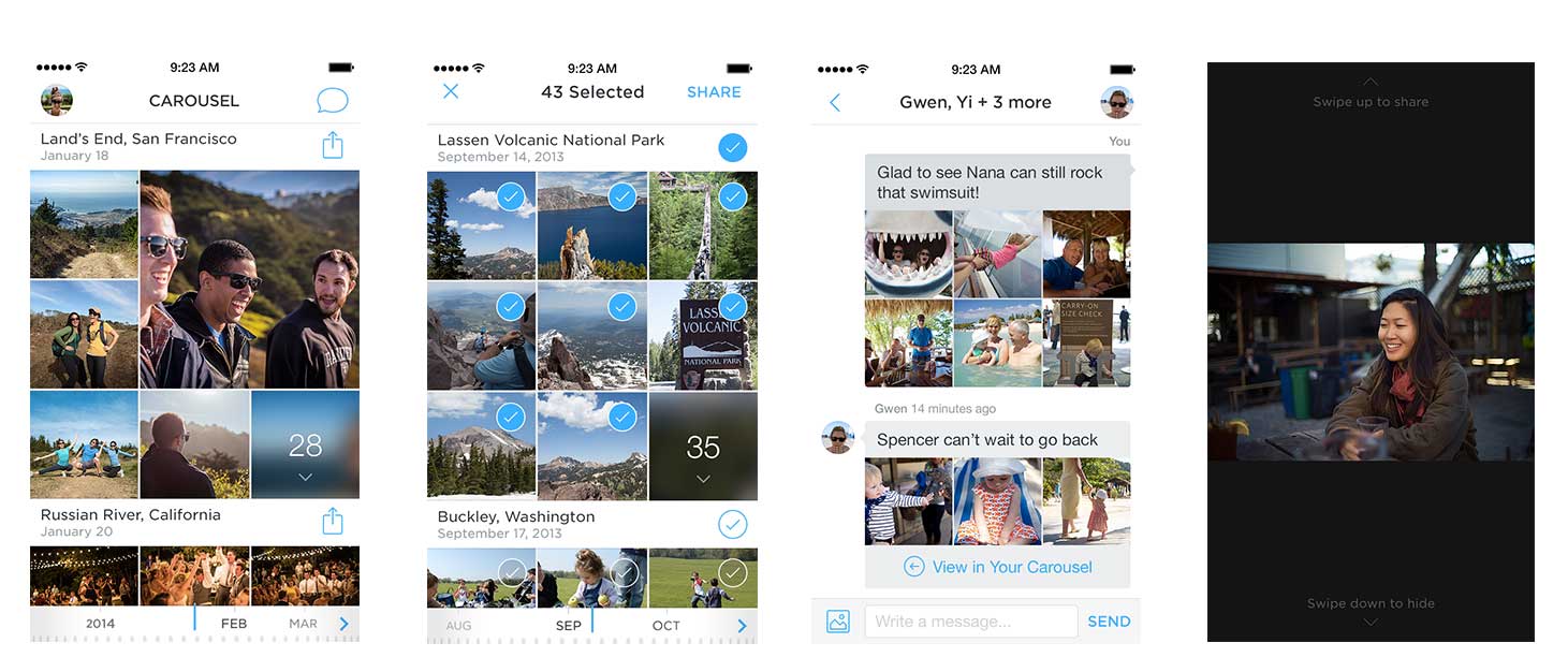 Carousel (compatibile sia con iOS che Android) permette di combinare foto memorizzate sull’account Dropbox con quelle sulla memoria del dispositivo ed eseguire il backup automatico man mano che se ne scattano altre. L’app può dividere i ricordi per eventi, permettendo di scorrere avanti e indietro nel tempo le immagini. Rispetto ad altre app, Carousel non ha limitazioni in termini di spazio del dispositivo; più o o come come accade per iCloud che non di fatto non ha limiti di “peso” ma di tempo e quantità di condivisioni su base oraria. I Carousel on mancano ovviamente funzioni di condivisione. L’app dovrebbe arrivare a breve su App Store e Play Store