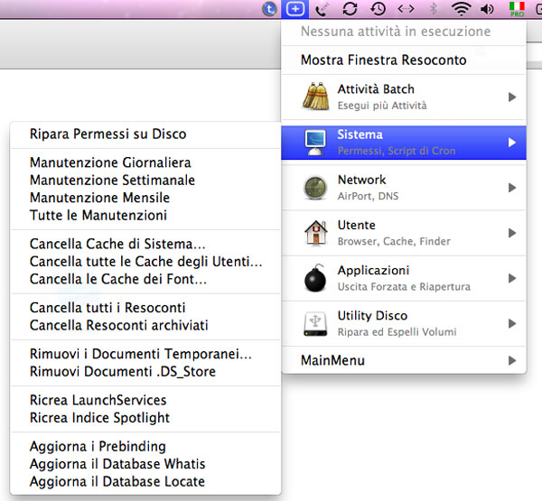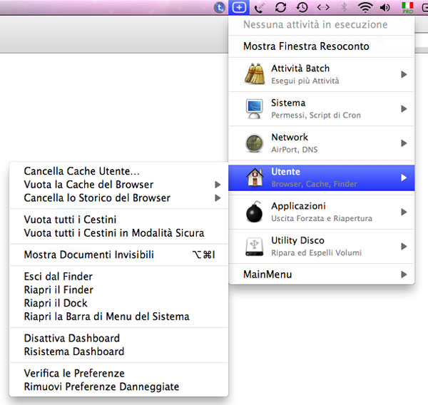 MainMenu, ora alla versione 2.05, offre una interfaccia minimalista e facile da usare, ricordiamo inoltre che il programma è ora disponibile completamente tradotto in Italiano grazie alla localizzazione curata da Massimo Rotunno. Tra le altre funzioni interessanti di MainMenu ricordiamo la cancellazione dei file temporanei, la possibilità di abilitare e disabilitare la Dashboard, la rimozione delle preferenze dei file corrotte e molto altro ancora. Grazie a MainMenu l’utente può avviare le singole operazioni di manutenzione manualmente oppure creare dei gruppi contenenti le operazioni eseguite più frequentemente, per poi lanciarle in automatico per l’esecuzione in batch.