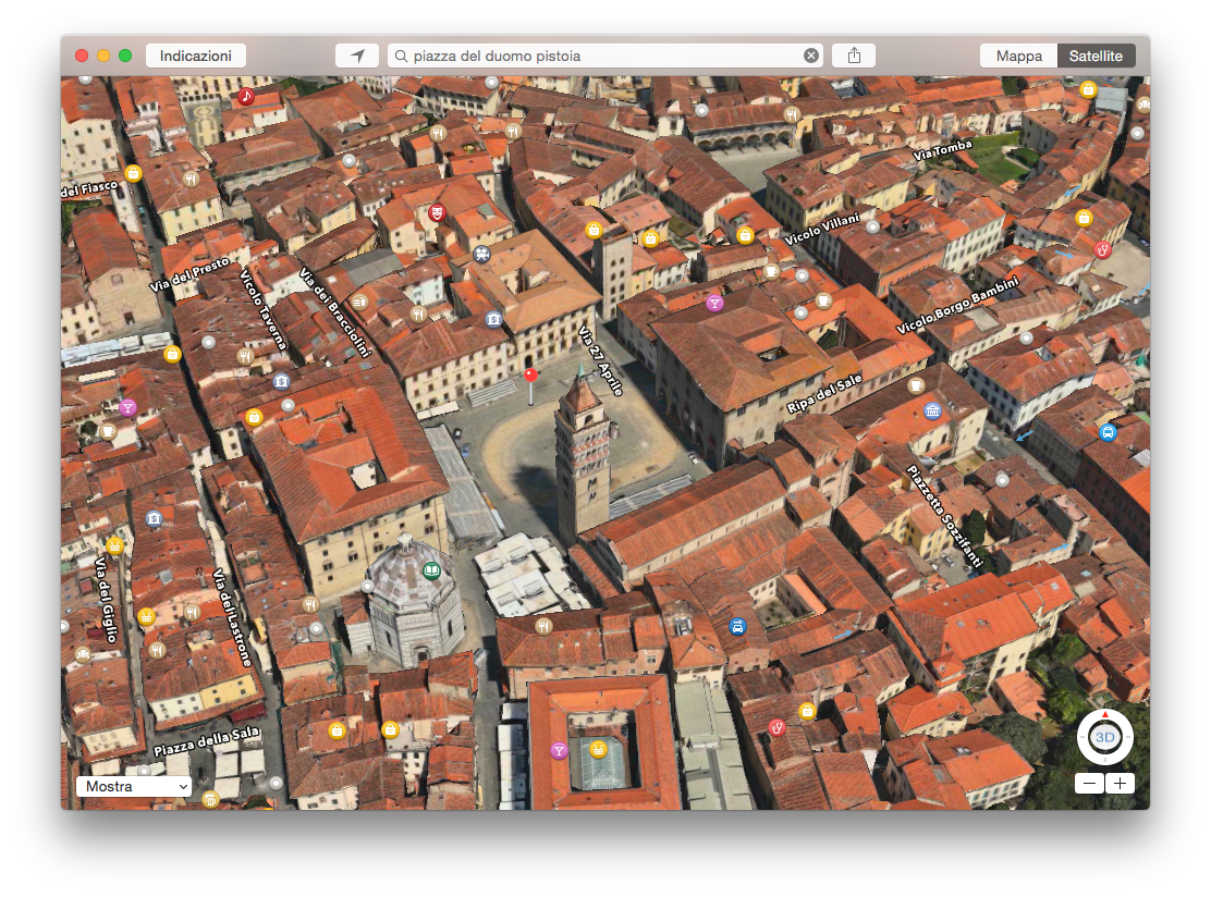 Continua Apple a migliorare in sordina le proprie mappe, aggiungendo nuove città italiane all’elenco di località che supportano la visuale in 3D. Di recente, ci segnala il nostro lettore Lorenzo, che ringraziamo, è stato introdotto il supporto in tre dimensioni per Firenze, Prato e Pistoia, con tutti i comuni limitrofi, come Scandicci, Sesto Fiorentino e Campi Bisenzio.