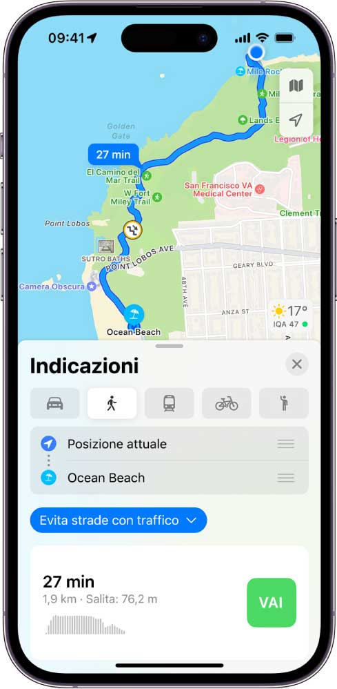 Sui modelli supportati (iPhone SE e iPhone 11 e seguenti) e in alcune aree selezionate, è possibile visualizzare le istruzioni a piedi in una vista che utilizza la fotocamera di iPhone e la realtà aumentata per mostrare dove svoltare. Dati di riferimento possono essere usati per migliorare la precisione delle funzionalità di Realtà Aumentata.
