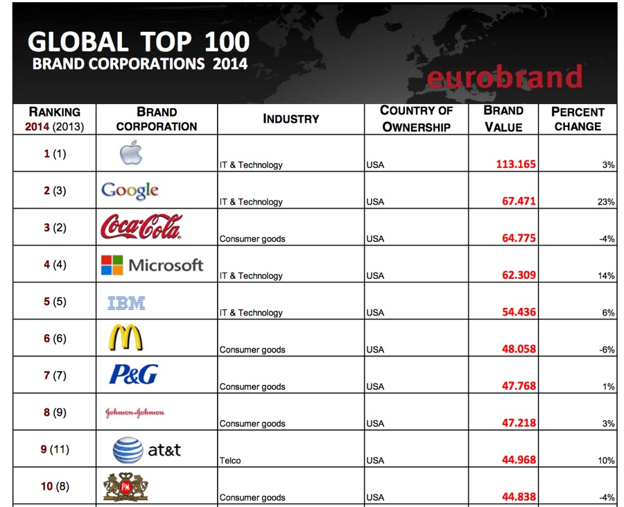 Anche secondo Eurobrand il marchio Apple è quello che vale di più al mondo: la classifica dei primi 100 in cui domina Apple è realizzata esaminando oltre 3mila società in 40 paesi, calcolando una stima del valore monetario del marchio. Quello della Mela morsicata vale ben 113 miliardi di euro, con un incremento contenuto del 2,8% rispetto al 2013, che nulla cambia nella classifica. Apple infatti rimane saldamente al primo posto a grande distanza da Google che da terza nel 2013 cresce del 22,7%, supera Coca-Cola e diventa il secondo marchio più importante.