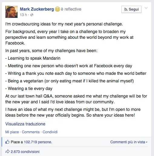 Il CEO di Facebook cerca ispirazione per il prossimo 2015, e la cerca proprio su Facebook, dove ha pubblicato un post pubblico chiedendo alla comunità di Facebook di suggerirgli quali potrebbe essere il prossimo proposito per l’anno appena iniziato.
