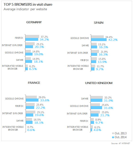 La situazione varia ad ogni modo da paese a paese. Il browser di Mozilla va ad esempio forte in Germania dove vanta un market share del 34.2% (perdendo però tre punti percentuale rispetto allo scorso anno); Chrome e Safari sono al terzo e quarto posto, guadagnando nella Repubblica Federale ben il 19% e il 18.1% rispetto all’anno scorso.
