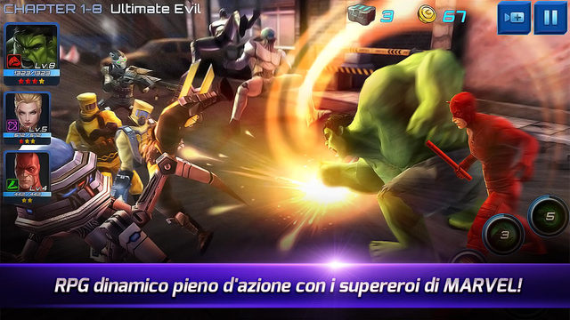 Per creare la propria squadra, da mandare in campo in combattimenti RPG, il giocatore potrà pescare da un ampio bacino di personaggi, compresi tra supereroi e supercriminali. Si potrà scegliere di portare sul campo da combattimento i Vendicatori, Hulk, Iron Man e Capitan America, e altri famosi eroi Marvel, come l’Uomo Ragno e Devil. Ovviamente, ciascuno di questi protagonista battaglierà secondo le proprie caratteristiche uniche, potendo potenziare le armi tramite un classico sistema di livelli e punti esperienza, tipico di ciascun titolo RPG. Le battaglie che avranno luogo in questo nuovo gioco per iOS si svolgeranno in arene 3 contro 3, anche se per giungere ai vari scontri si dovrà vagare per la campagna di gioco, nell’attesa di incrociare la strada di uno dei numerosi nemici presenti. E’ possibile scegliere diversi sistemi di controllo, potendo azionare i personaggi con singoli tap a schermo, o scegliendo una configurazione più tradizionale per il tramite di un pad virtuale.