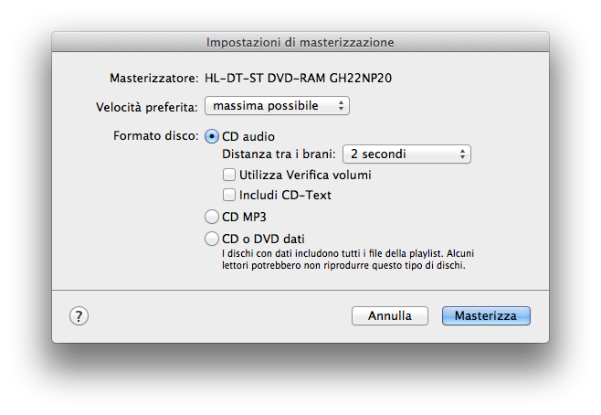 Per masterizzare con Mac un CD audio con le ultime versioni di iTunes, è sufficiente creare una playlist, trascinare i brani destinati al supporto dalla libreria generale alla playlist e infine scegliere dal menu “File” la voce “Masterizza playlist su disco”. Dalla finestra che compare è possibile selezionare: velocità di masterizzazione, distanza tra i brani, se scrivere o no il supporto CD-Text (le specifiche che consentono la memorizzazione di informazioni addizionali come ad esempio il titolo dell’album, delle canzoni, dell’artista) su un CD audio standard.