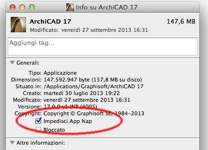 L’inconveniente è facilmente risolvibile portandosi nella cartella con l’applicazione, selezionandola, attivando la finestra Ottieni Informazioni (cmd-I) e selezionando (mettendo il segno di spunta) la voce “Impedisci App Nap”. App Nap è una funzione che permette di ridurre i consumi delle applicazioni mentre non sono in uso.