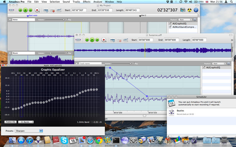 Amadeus – premiata al concorso per “Schweizer Jugend Forscht” – oggi è un software essenziale per l’editing audio: con questa applicazione per Mac si possono creare suonerie per iPhone, digitalizzare musicassette e dischi in vinile, convertire da e verso tutti i formati audio principali, registrare anche sessioni audio dal vivo, utilizzare un wave editor per visualizzare, modificare, ripulire e arricchire le registrazioni audio e molti altri effetti speciali (un elenco infinito grazie al supporto per le Audio Units sviluppate da terze parti, molte delle quali sono disponibili anche gratuitamente).