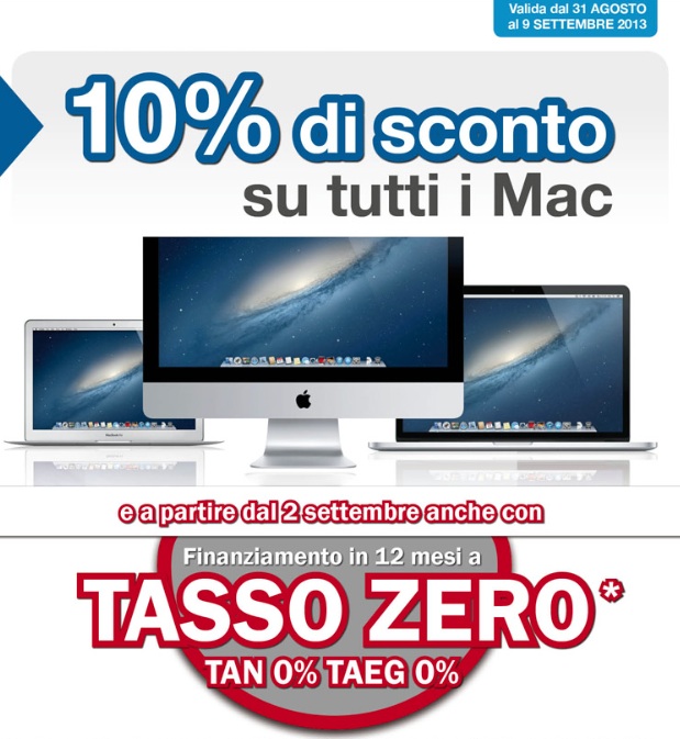 Termina oggi presso Med Store [sponsor] l’offerta speciale 10% sconto Mac + tasso zero. Il rivenditore Apple con negozi a Pesaro, Ancona, Macerata, Civitanova Marche, Ascoli, Teramo, Foligno e Perugia propone fino alla mezzanotte di oggi a tutti i suoi clienti una straordinaria offerta: 10% sconto Mac, anche sui modelli configurati. Lo sconto è valido sia per acquisti in negozio che per acquisti online con spedizione gratuita, a partire da questo link .