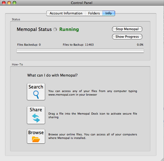 Ricordiamo che Memopal memorizza le nostre informazioni in 3 sistemi diversi e lontani geograficamente, permette di recuperare qualsiasi versione del file cancellata perché ha una history praticamente infinita (salvo specificazione contraria dell’utente) infine permette di accedere ai nostri file da qualsiasi computer collegato al Web in cui sia installato il software Memopal. Ricordiamo che Memopal è ora multipiattaforma e permette così la condivisione di file tramite Web tra sistemi diversi: Windows, Mac e prossimamente anche Linux.