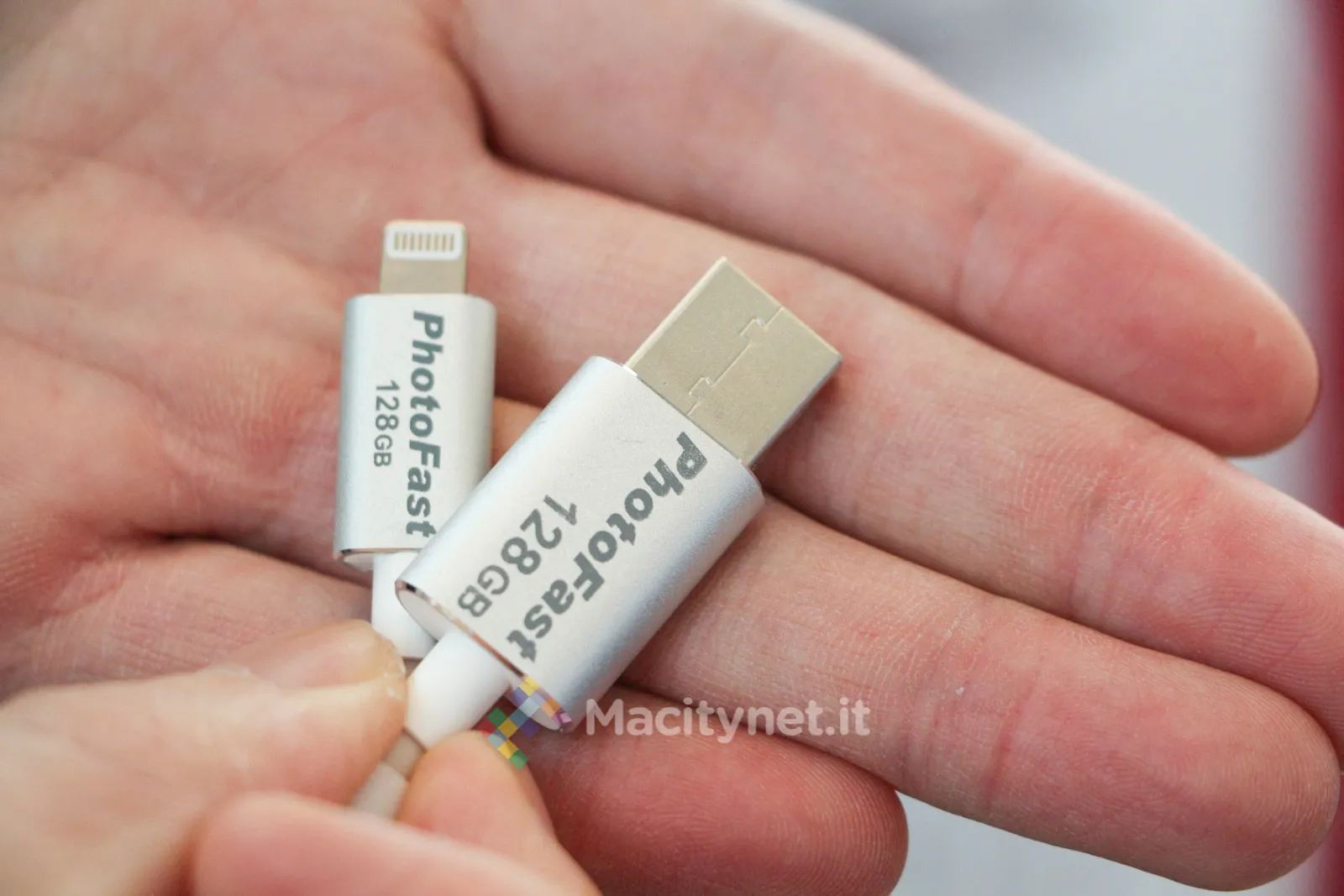 A correre in aiuto di iPhone e iPad quando lo spazio su disco non basta più ci ha pensato Photofast con il nuovo MemoriesCable mostrato per la prima volta al mondo durante l’IFA di Berlino. Si tratta sostanzialmente di un cavetto Lightning lungo all’incirca 13 centimetri che, se al primo sguardo può sembrare soltanto un cavo per le ricariche in mobilità, in realtà se collegato al dispositivo può aggiungere fino a 128 GB di spazio di archiviazione.