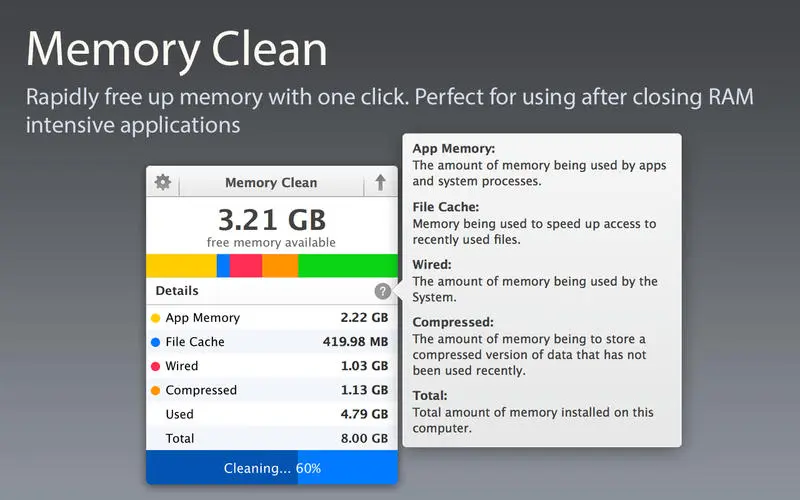 Memory Clean è una piccola e comoda utility per Mac che permette di ottimizzare la memoria del computer rapidamente e con un solo click. Integrandosi direttamente nella barra di stato, è sufficiente cliccare su Clean Memory quando tutto sembra andare lento per evitare il riavvio della macchina e tornare subito operativi in pochi secondi.