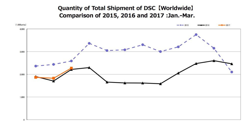 Il suggerimento viene dalle spedizioni nel primo trimestre 2017 delle macchine fotografiche digitali con lenti integrate, rimaste piatte rispetto allo stesso periodo del 2016. Questo non è certo una dato positivo ma segue 21 trimestri consecutivi di calo annuale delle vendite. Oltre a ciò, il valore in termini di ricavi di queste spedizioni è aumentato del 7% rispetto allo stesso periodo dell’anno scorso.