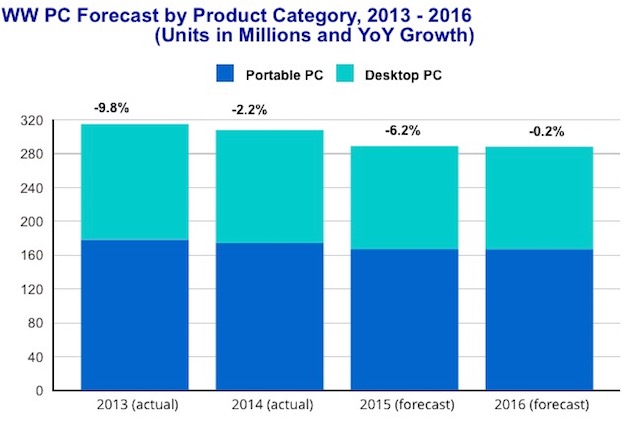 “Fatta eccezione per gli smartphone che sono ancora in crescita”, spiega IDC, “per i volumi combinati di PC, tablet e smartphone si attende una crescita a una sola cifra dal 2015 al 2019 con la saturazione e il “sentimento” dell’avere un “computer abbastanza buono” che si estende anche al mercato dei tablet per il quale è previsto un ulteriore declino nei volumi di vendita per il 2015.
