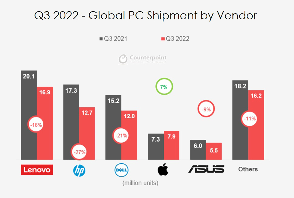 Nel terzo trimestre 2022 le spedizioni globali di PC sono diminuite del 15,5%, arrivando a 71,1 milioni di unità, registrando un declino anno su anno.