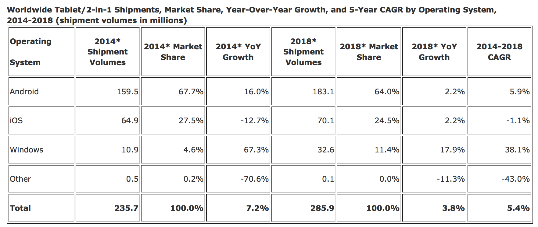 Secondo i dati della società di ricerca, l’anno in corso terminerà con una crescita del mercato tablet pari a solo il 7.4% rispetto al 2013, un progresso dovuto in gran parte alle vendite conseguite nei mercati emergenti. In queste regioni sono i dispositivi Android a dominare la scena; non stupisce quindi che siano i dispositivi del robottino ad avere, anche su scala mondiale, i risultati migliori con vendite in crescita del 16%. iPad perderà invece il 12.7 per cento rispetto alle vendite dello scorso 2013.