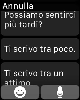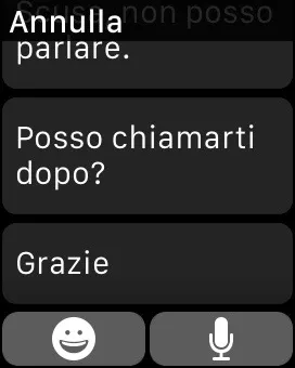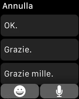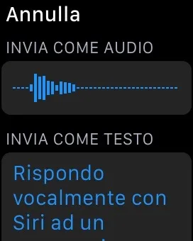 Fatto ciò, ogni qual volta arriverà un messaggio su iPhone, questo sarà immediatamente replicato sul piccolo schermo dell’indossabile. E’ sufficiente ruotare il polso per prendere visione del messaggio. Se non importa rispondere al messaggio ricevuto sarà sufficiente abbassare il braccio e tornare ad una posizione standard; al contrario, se interessa rispondere al messaggio sarà necessario scorrere verso il basso il testo utilizzando la corona digitale. Alla fine del pop up contenente il messaggio, in basso sullo schermo, appariranno le opzioni Rispondi. Da questo menù sarà possibile scegliere immediatamente una delle risposte predefinite, scorrendole con la corona digitale. Se tra queste risposte non è presente il messaggio desiderato, si potrà scegliere di rispondere vocalmente, cliccando sull’icona del microfono. Si avvierà automaticamente Siri, grazie al quale poter dettare il proprio messaggio. Terminata la dettatura sarà il momento di scegliere se inviare il proprio messaggio vocale come file audio, oppure come file testuale, cliccando una delle due opzioni.