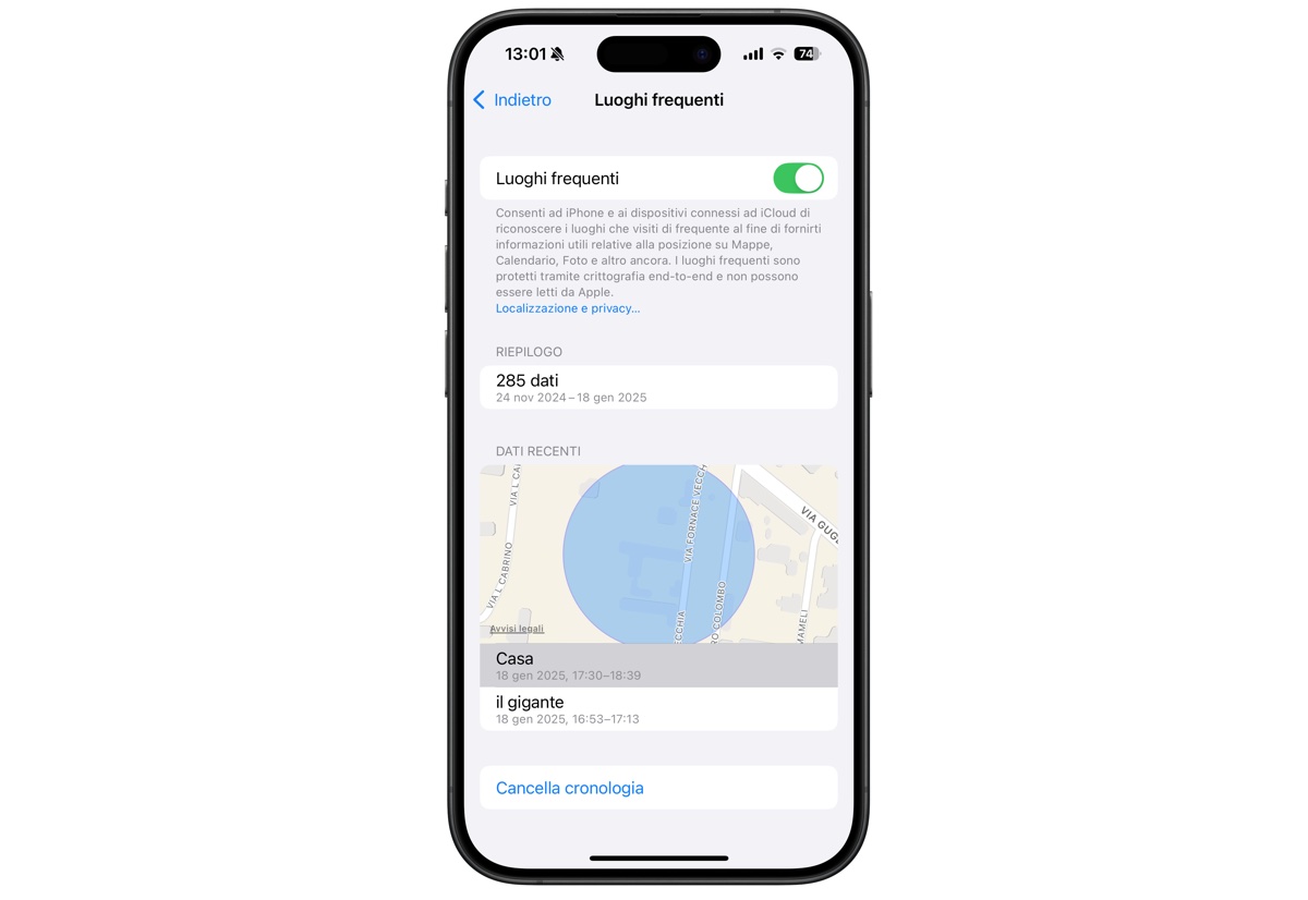 I luoghi frequenti sono le posizioni ricorrenti in cui ci troviamo quando abbiamo l’iPhone. Vengono aggiunte automaticamente ad un elenco (Impostazioni → Privacy e sicurezza → Localizzazione → servizi di sistema luoghi frequenti) e sono leggibili solo in minima parte.