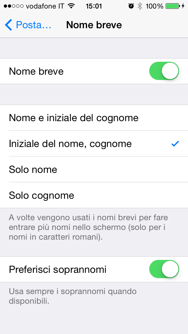 Andiamo in Impostazioni –> Posta, Contatti, Calendari; arriviamo alla sezione Contatti. Qui troveremo l’indicazione “Nome breve”. In questa sezione, abbiamo la possibilità di disabilitare del tutto il nome breve (che significa mettere vedere il nome e il cognome), oppure di selezionare le seguenti opzioni