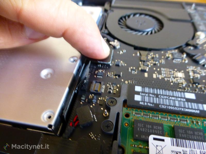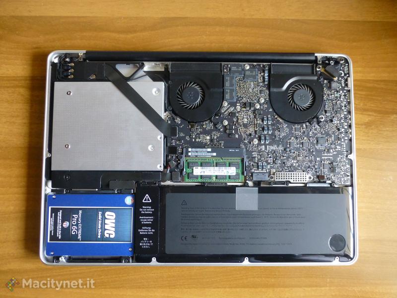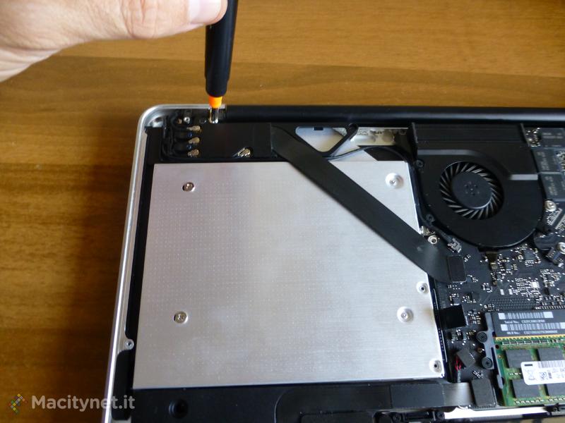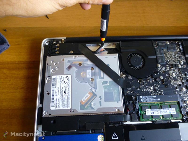 La sostituzione del disco fisso con una unità SSD non presenta problemi particolari e può essere completata da chiunque con un po’ di pazienza in pochi minuti, questo nei MacBook Pro unibody. Viceversa la rimozione dell’unità ottica Superdrive richiede di intervenire su cavi piatti molto delicati da sganciare e riagganciare e poi anche di intervenire su diverse viti piccolissime che si trovano in anfratti difficili da raggiungere dello chassis.