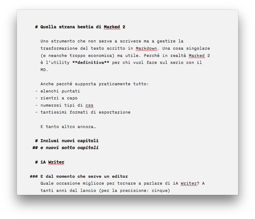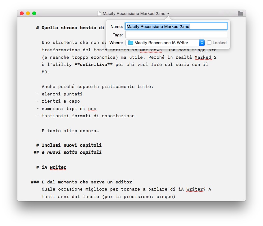 Il motore grafico di iA Writer, il rendering del Markdown, la capacità di trasformarlo in Html, tutto questo è rimasto a grandi linee uguale. E comunque è “congelato” da almeno due anni. L’evoluzione tecnologica più significativa è stato aggiungere l’integrazione con iCloud mentre l’integrazione con Dropbox è garantita dall’accesso al file system del computer. Sembra una osservazione piuttosto sciocca, se non si sa che invece iA Writer 3 (Macity l’ha recensito qui) gestisce diversamente l’accesso a Dropbox: passando per il pannello di sinistra per il browsing dei documenti, cosa che lo avvicina molto alla versione per iOS.