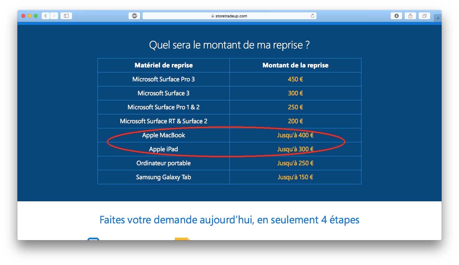 Agli utenti europei era finora offerto di meno, un massimo di 100 euro; la Casa di Redmond ha però ora attivato una nuova iniziativa specifica per il Surcace e ora arriva a offrire fino a 400 euro per chi abbandona il MacBook, e fino a 300 euro a chi abbandona l’iPad. Che questo sia perchè la “taglia” precedente non fosse sufficiente o perchè Microsoft ha fatto qualche calclo più preciso, non è dato di sapere. Quel che è certo è che per convincere gli utenti Apple, Redmond ha messo in conto di pagare di più: per altri computer portatili sono offerti 250 euro; per chi abbandona il Samsung Galaxy Tab 150,00 euro. Solo gli utenti di Surface Pro 3 sono trattati meglio: vengono loro offerti 450,00 euro.