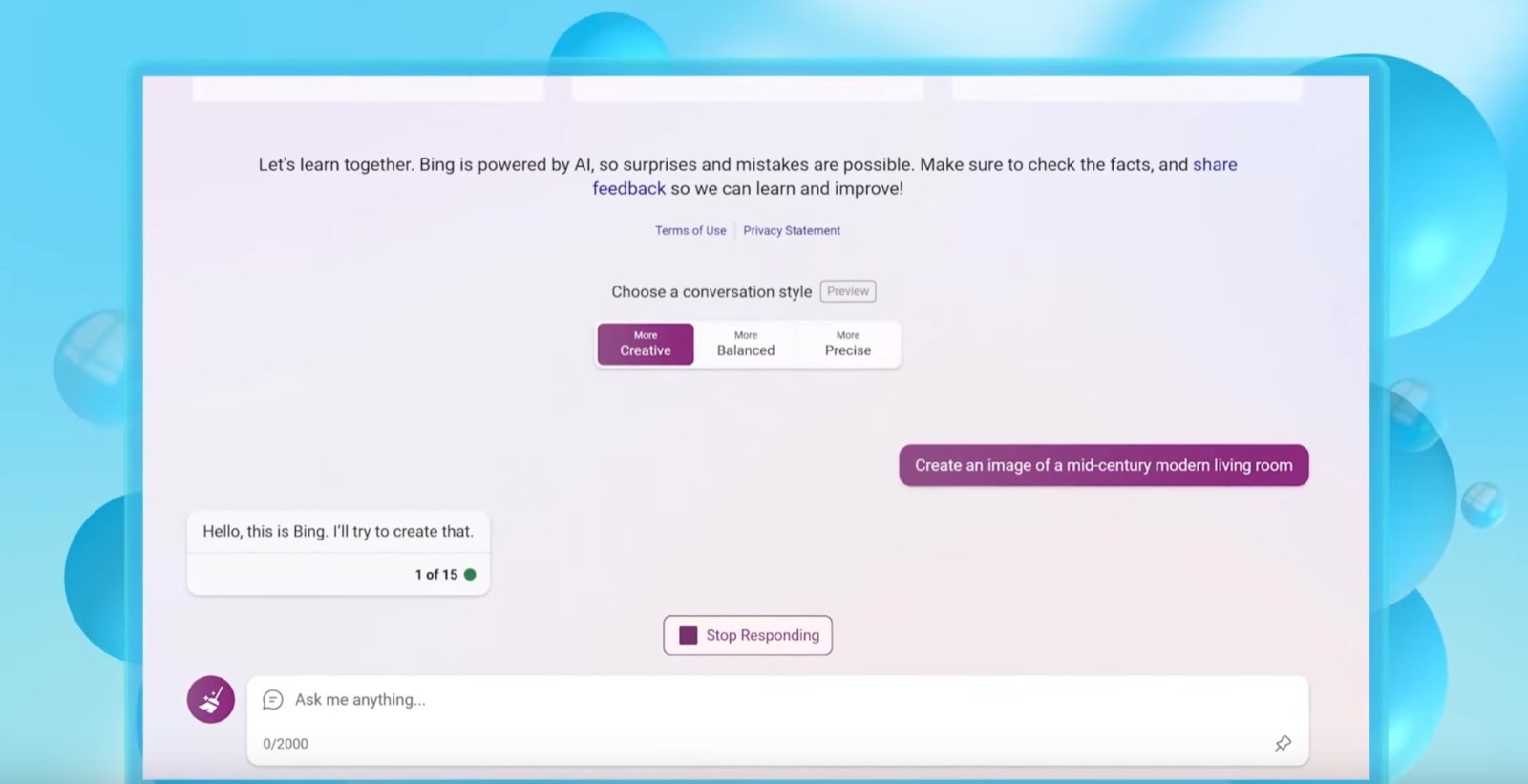 Questo nuovo passo nel nostro viaggio consentirà a Bing di mostrare il suo incredibile valore nel generare risposte sintetiche, nella creazione di immagini e altro ancora, ad una più vasta platea.