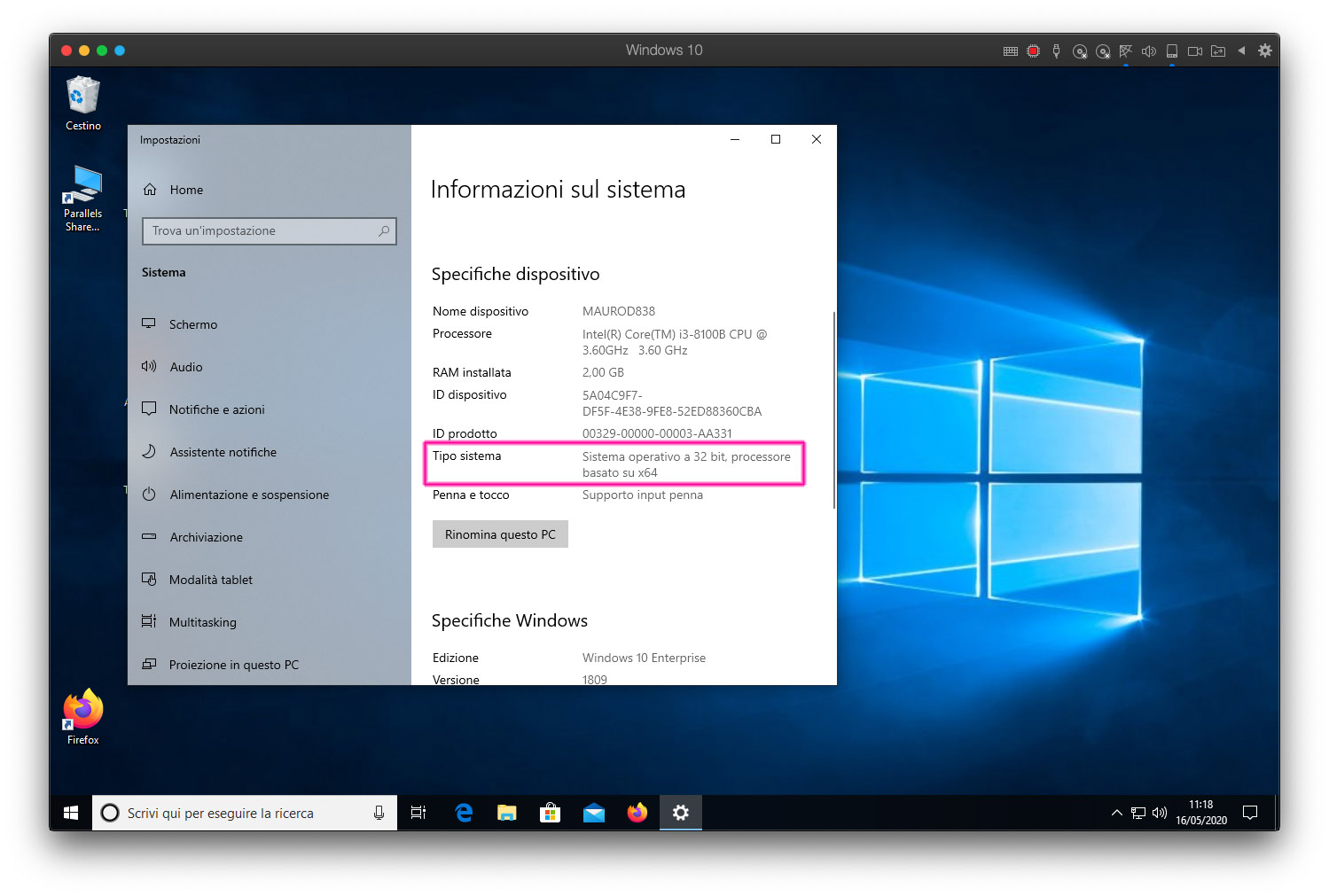 Nella sezione “Sistema”, alla riga “Tipo sistema” è possibile verificare quale sistema operativo è attualmente in esecuzione, e in con supporto per l’elaborazione a 64 bit puoi verificare se è supportata l’esecuzione di una versione di Windows a 64 bit. Se nel computer è già in esecuzione una versione di Windows a 64 bit, con supporto per l’elaborazione a 64 bit non è visibile.