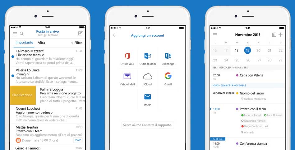 La gestione della posta elettronica è semplificata dai movimenti di scorrimento rapido che consentono di pianificare, eliminare e archiviare messaggi velocemente. È possibile creare filtri “intelligenti” e ordinare la posta in arrivo come si desidera, accedere ai calendari con un tocco e trovre orari compatibili con gli altri partecipanti, visualizzare e allegare file dall’email e da OneDrive, Dropbox e altre posizioni, senza doverli scaricare nel telefono.