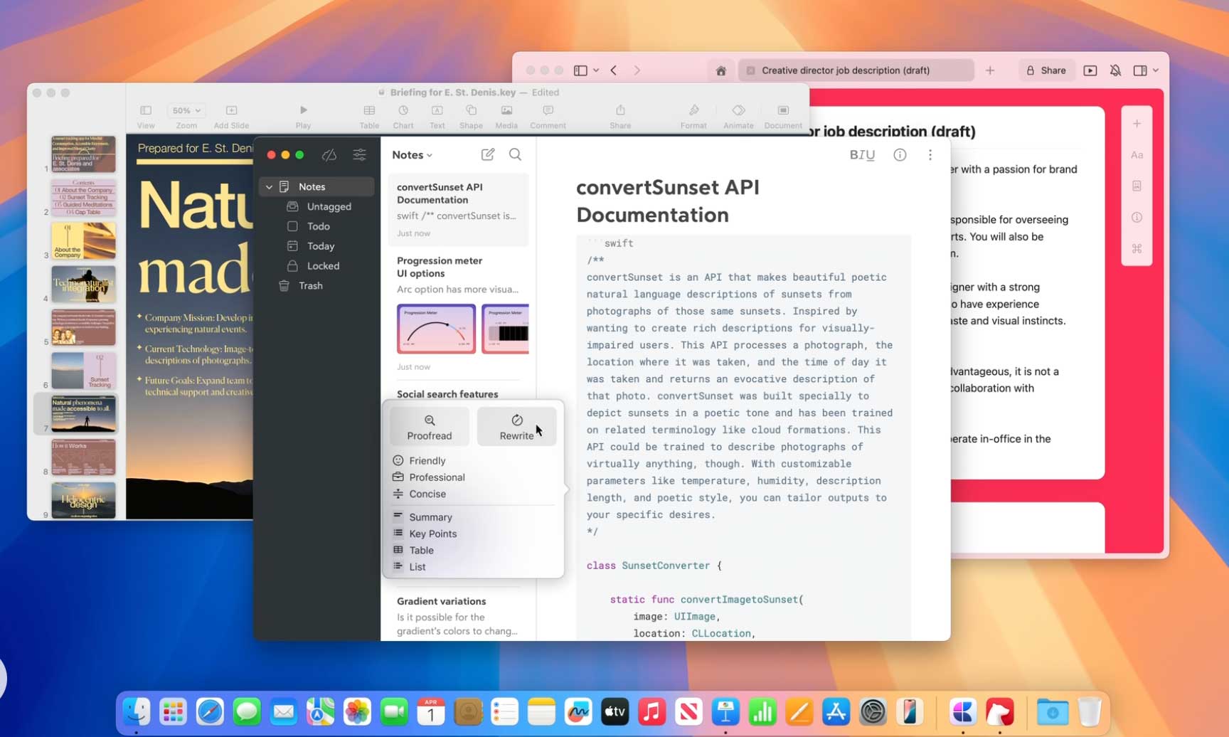 Profondamente integrati in iOS, iPadOS e macOS, gli Strumenti di scrittura consentono all’utente di perfezionare i testi che scrive rielaborandoli, correggendoli e riassumendoli praticamente ovunque li scriva, incluse le app Mail, Messaggi, Note, Pages e quelle di terze parti.
