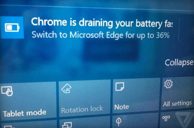 Gli utenti di Windows 10 hanno iniziato a segnalare alcune notifiche ricevute direttamente sul sistema operativo allo scopo di convincere la gente a smettere di utilizzare il browser di Google. “Chrome sta prosciugando la tua batteria più velocemente” si legge nella la notifica. “Passare a Microsoft Edge garantisce fino al 36 per cento in più di tempo di navigazione” consiglia Microsoft ai suoi utenti.