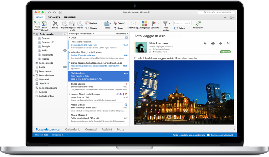 OneNote permette di prendere appunti ovunque, condividendo e collaborando con altri. Le nuove funzionalità di Outlook includono il supporto dell’Archivio online, la sincronizzazione dell’elenco categorie, il meteo nel calendario, le app per Office, funzione “Suggerisci pianificazione alternativa” e calendari affiancati.