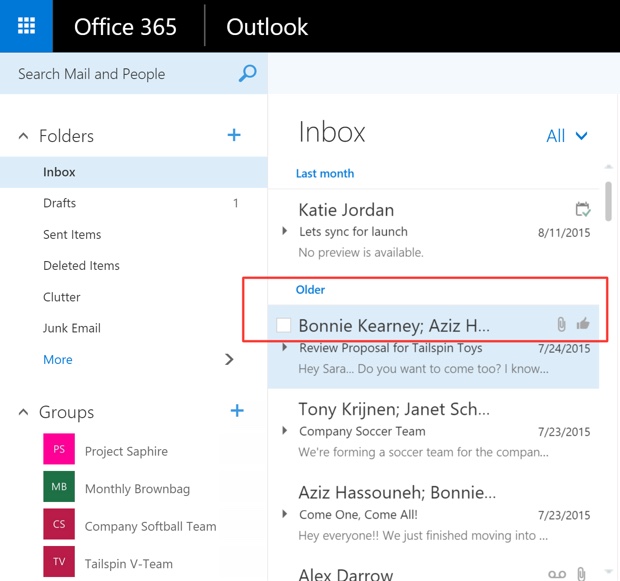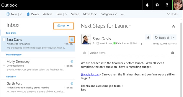 Se il Mi Piace, rappresentato anche in Microsoft Outlook con l’universale icona della mano con pollice alzato, permette di evidenziare thread di messaggi e discussioni email, con i tag @Mentions è invece possibile portare l’attenzione direttamente sulle persone citate. Mentre scriviamo una mail inserendo il carattere @ si apre la lista dei contatti dell’utente in cui è possibile selezionare quello desiderato. Se il contatto non è stato già incluso tra i destinatari, Outlook lo fa al volo per noi. Chi riceve il messaggio in cui è taggato, vedrà il proprio nome evidenziato in blu, mentre un contrassegno @ risulta visibile direttamente nella cartella della posta in arrivo. Qui chiunque può visualizzare solo i messaggi ricevuti in cui si è taggati, per essere sicuri di aver risposto a tutti.