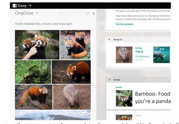 Sway è un nuovo applicativo di Microsoft che offre un mix di funzionalità presenti in Evernote, Ember, iWeb e anche Keynote. Si presenta come un servizio per “creare e condividere storie e presentazioni”, funziona su più dispositivi ma al momento è necessario richiedere un invito per provarlo in anteprima. Le presentazioni si adattano automaticamente al dispositivo usato, indipendentemente dalle dimensioni del suo schermo, e risiedono sul cloud consentono di richiamarle in qualsiasi momento da un browser web (a patto di avere una connessione a internet).