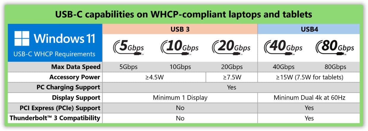 Ogni cavo può avere sue specificità (alcuni modelli offrono prestazioni migliori, alcuni supportano l’USB Power Delivery, la funzionalità DisplayPort Alt Mode e altre funzionalità ancora). Microsoft ha deciso di rende obbligatorie le funzionalità opzionali con il Windows Hardware Compatibility Program (WHCP) per le porte USB Type-C. La tabella che riportiamo elenca i requisiti minimi per ottenere la compatibilità WHCP su notebook e tablet.