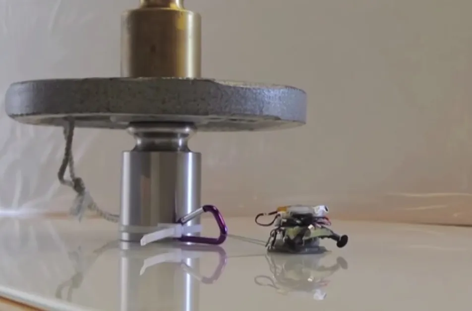 Gli ingegneri della Stanford University hanno creato dei robot in miniatura chiamati “MicroTugs” in grado di tirare e sollevare oggetti più di 100 volte il proprio peso. Il più forte dei bot pesa appena 12 grammi, ma può tirare oggetti 2.000 volte più pesanti di lui, fino a 24 KG (nel GIF sotto sposta un peso di 20,4 KG), circa secondo quanto riportato dal New Scientist. In scala umana, sarebbe l’equivalente di un uomo che trascina una balenottera azzurra, dice David Christensen, un ingegnere di laboratorio che ha creato i robot.