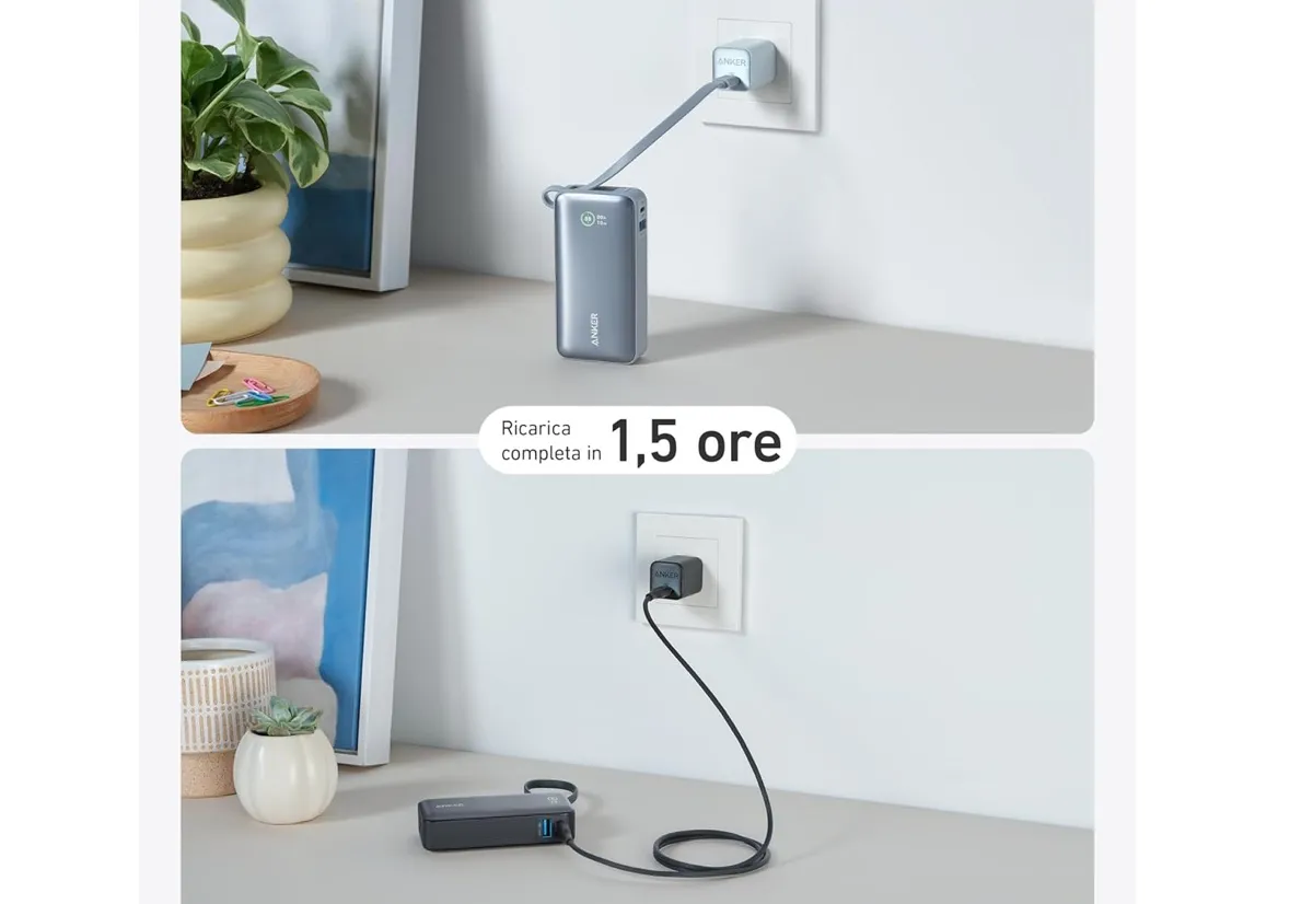 Una delle sue porte fornisce fino a 65W, quello che serve per una ricarica veloce del Mac; a sua volta si ricarica in circa due ore con un alimentatore da almeno 45W. Ha anche una seconda porta che è in grado di ricaricare un Mac o un iPad a 18W.