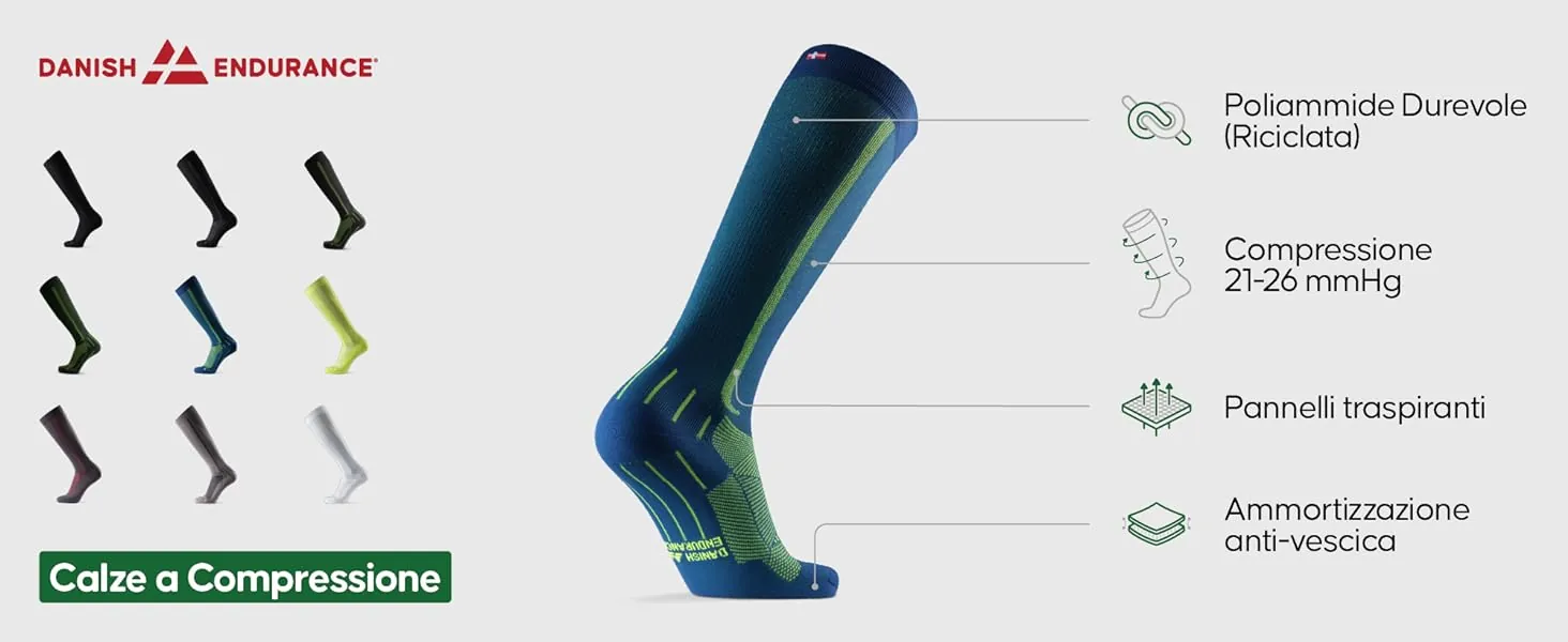 Tra le migliori calze a compressione graduata ci sono quelle di Danish Endurance, una società specializzata proprio in calze. Sono realizzate in Poliammide traspirante, hanno una compressione di 21-26 mmHg ed un sistema di ammortizzazione ed anti-vescica.