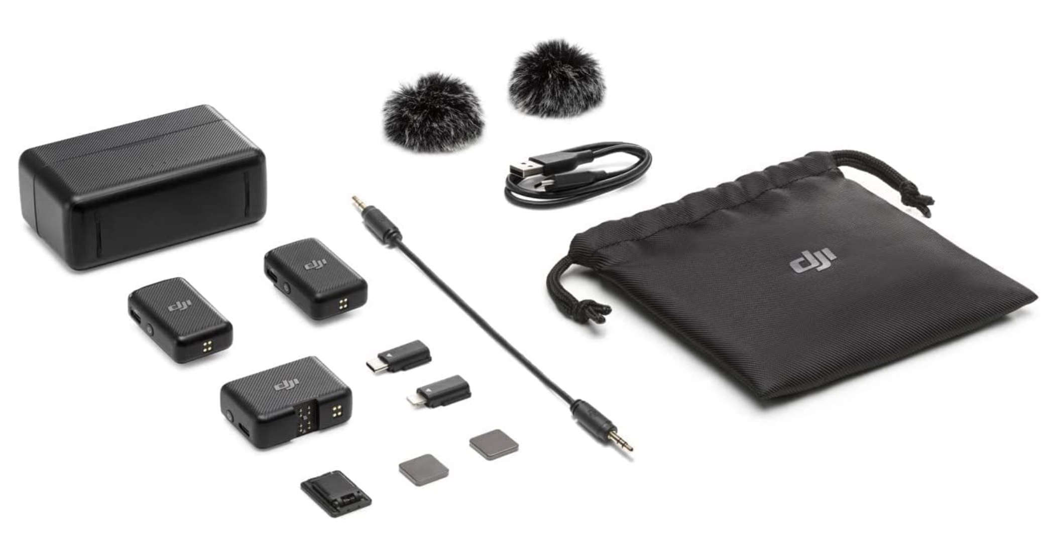 Il ricevitore di DJI Mic supporta l’uscita delle interfacce USB-C, Lightning e TRS da 3,5 mm e permette di avere un’intera giornata di registrazione audio con 5,5 ore di durata della batteria dai trasmettitori, 5 ore dal ricevitore e fino a 15 ore con la custodia di ricarica. Nella dotazione trovate anche due filtri antivento ed una comoda sacca per il trasporto.