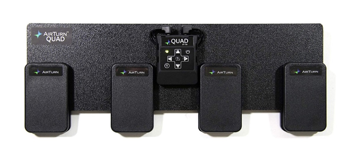Chi vuole invece semplificare l’uso delle app collegate ai propri strumenti musicali trova diverse soluzioni anche per quanto riguarda le pedaliere Bluetooth. Un buon ibrido è la pedaliera Quad di AirTurn. Costa 139 euro e funziona da voltapagina ma anche da controller remoto per gestire le luci, il metronomo o gli effetti precedentemente configurati sulle varie app. E’ dotata di 4 pedali e si collega via Bluetooth a dispositivi iOS, Android e PC.