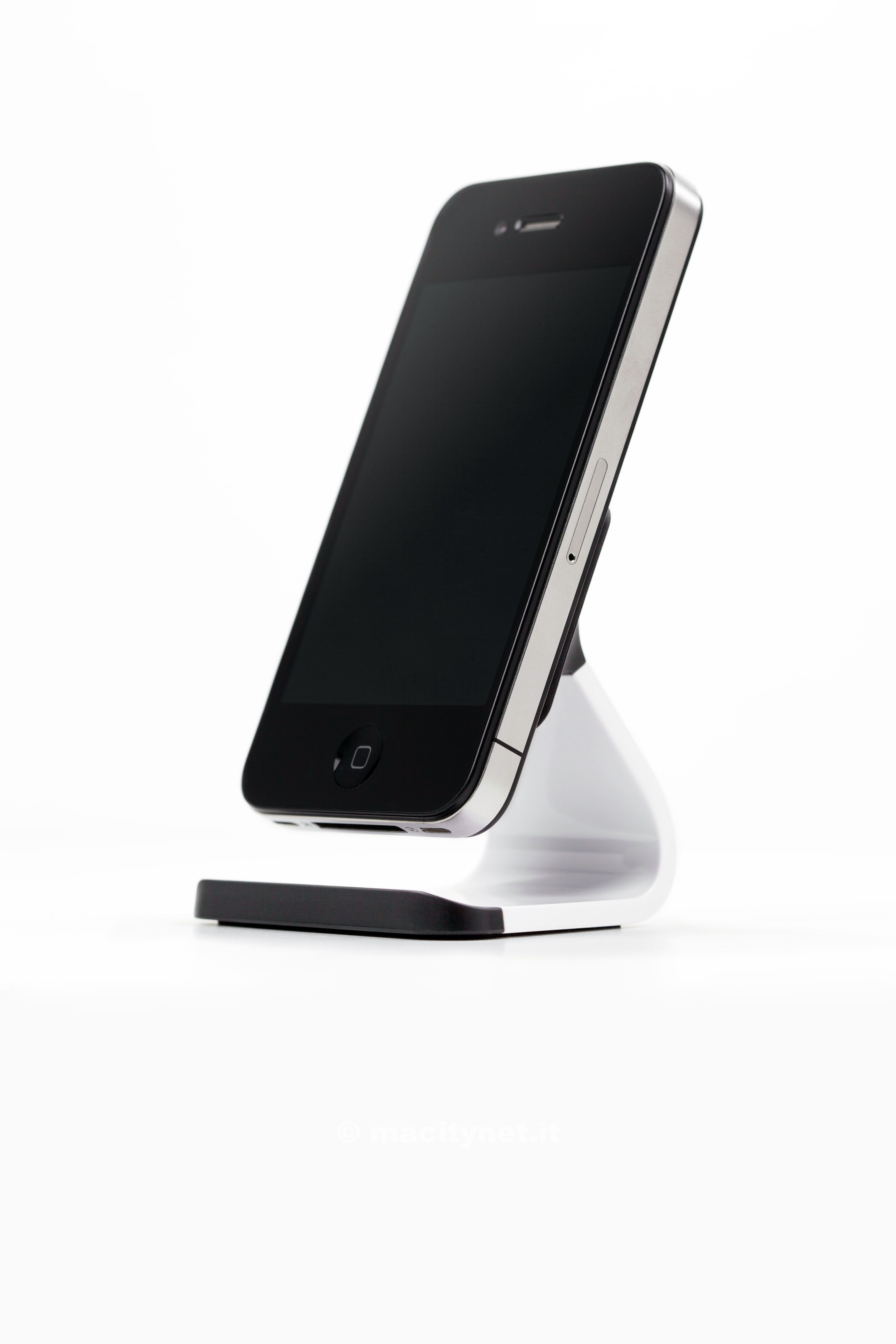 Una volta collocato sul tavolo il supporto, basterà appoggiare iPhone nella posizione che desideriamo, in verticale o in orizzontale, esercitare una leggerissima pressione e il gioco è fatto. iPhone resterà in posizione e potremo usarlo per guardare un film, come sveglia ed orologio, per rispondere ad una chiamata in viva voce e così via. L’angolazione è perfetta, la tenuta molto solida al punto che un urto accidentale deve essere davvero molto violento per spostare il supporto o staccare iPhone dal supporto stesso. Per spostarlo o rimuovere iPhone, quel che dovremo fare è esercitare una leggera torsione o partire da uno degli angoli.