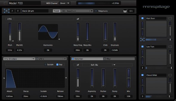 MiniSpillage 1.01 è un drum synthesizer gratuito basato su un motore DSP 64 bit ad alta risoluzione e su un insieme di algoritmi di sintesi esclusivi. Il software mette a disposizione un sottoinsieme delle caratteristiche che saranno disponibili in DrumSpillage (un drum synth commerciale che sarà prossimamente in vendita).