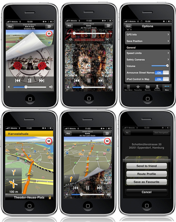 Due nuove funzioni migliorano invece la parte dedicata al “divertimento”: l’integrazione dell’iPod Control é semplice e veloce nel settare la playlist richiesta durante la navigazione. Basta selezionare il simbolo iPod sulla mappa per scegliere la playlist, i titoli e gli album, ascoltare le canzoni o lasciare al dispositivo il compito di generare una raccolta casuale di canzoni. Un altro tocco e l’utente puà³ tornare alla navigazione. Quando il software fa poi un annuncio acustico, il volume della musica si abbassa.