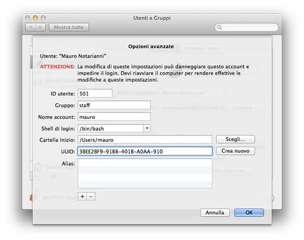 Ogni utente in OS X ha un “Nome completo” (detto “Nome” in OS X v10.5.8 e versioni precedenti) e un “Nome account” (detto “Nome breve” in OS X v10.5.8 e versioni precedenti) definito nel pannello Utenti e gruppi (o “Pannello Account” nelle versioni precedenti di OS X) delle Preferenze di sistema. Il nome account può contenere fino a 255 caratteri minuscoli senza spazi. Questo nome è utilizzato per creare la cartella principale dell’utente (detta anche “Inizio” o “cartella Inizio dell’utente”) nella cartella Utenti. Una volta che è stato creato l’utente, il nome account (o il nome breve) NON può essere modificato nel pannello Utenti e gruppi delle Preferenze di sistema. Anche se esistono altri metodi con cui un utente avanzato può modificare il nome breve e le informazioni correlate, Apple consiglia di seguire le procedure indicate nel documento sopra linciato (ci sono le indicazioni per OS X 10.5 e seguenti e per le versioni precedenti di OS X). Prima di applicare le procedure, è consigliabile eseguire il backup dei dati importanti.