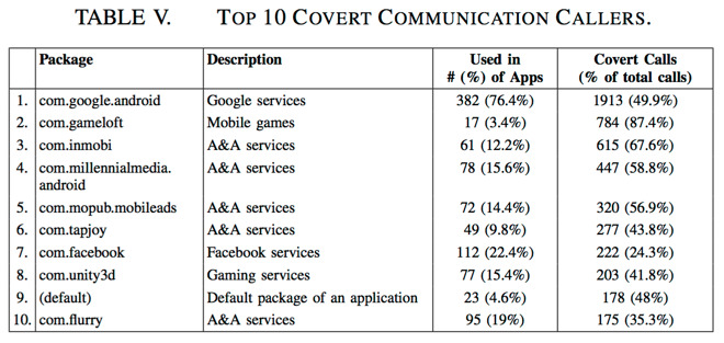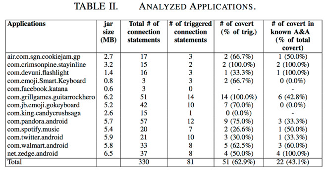 Nello studio sono stati analizzati i dati ricevuti e trasmessi dal 500 tra le app più popolari disponibili per Android, scoprendo che in circa il 50% delle comunicazioni rilevate non hanno nulla a che fare con la raccolta di dati sul loro utilizzo (il tracciamento analitico e statistico) e non informano neppure l’utente sulle comunicazioni in corso. Se in alcuni casi è comprensibile il motivo della comunicazione di alcuni dati,che in assenza di un collegamento ad Internet o ad un database remoto, non avrebbero modo di funzionare, in altri casi non è per niente chiara l’utilità di inviare dettagli come ad esempio l’account eBay come succederebbe con un’app di Wall Mart